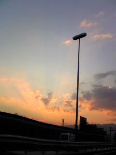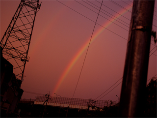 赤い夕焼け時に見えた虹なので、なんだか不思議なことに。